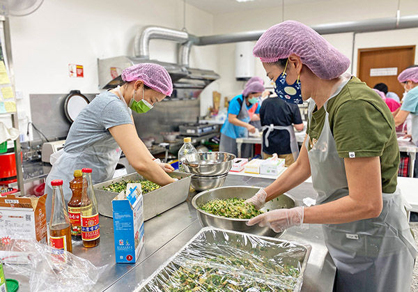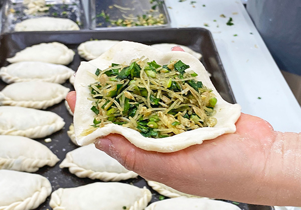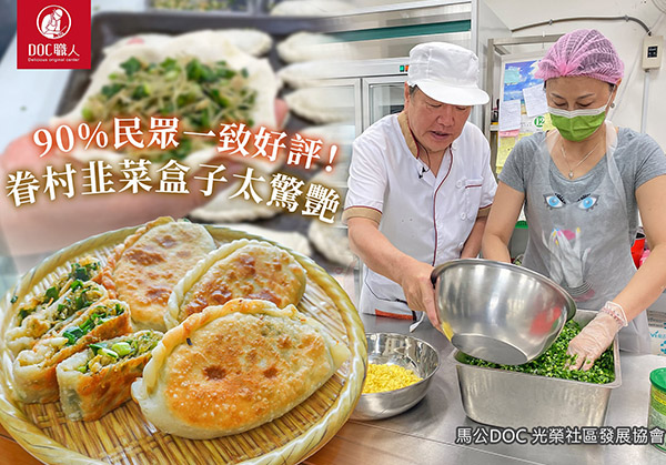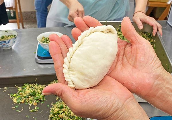 陳總幹事推行眷村美食的教學已有三年,蔥燒餅、燒麥、花卷都不藏私的傳授給每位學員,因此越來越多人成為學習的一份子,社區還因而成立媽媽教室,甚至合作長者供餐更穩定和多樣化,像最經典的韭菜盒子,內餡滿滿雞蛋、豆乾、冬粉等,加上道地的風味調料,酥脆外皮、恰到好處的鹹香滋味,連在地開店的餐飲業者也來學習。