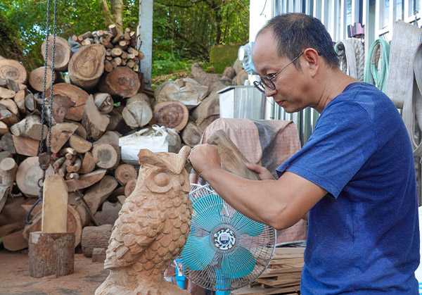 對賴瑞儒老闆來說,木頭每個部位都可以拿來創作,但會根據木料的大小和木頭的紋路,來設計成品,像紋路較直的木頭,就很適合用來製作大型家具或櫥櫃;崎嶇的木紋則是適合做成木雕品。他的人氣木雕品之一「貓頭鷹」,從選材、畫草圖、裁切粗胚,再用雕刻刀一鑿一鑿把貓頭鷹的外型、羽毛的紋理完成,至少要花一個月時間才能完工,即使過程繁瑣、耗時,他也甘之如飴,並持續精進自己的雕刻技法,希望讓更多人看見手工木雕的魅力。