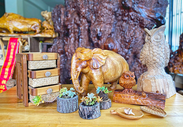 瀰漫著樟木香氣的天然奇木,店內陳列了許多木藝品,走獸、貓頭鷹、桌椅,都是賴瑞儒老闆和他父親的親手雕刻而成的作品。因為耳濡目染,加上喜歡木頭溫暖的質感,從父親手中接棒後,用雙手延續傳統技藝,也打造自己風格的木藝創作。