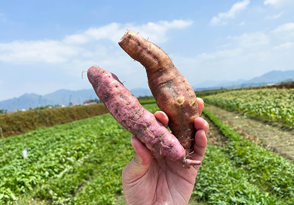 美濃永盛無毒農產的農田裡,用友善環境的方式,種滿各種農作物,單是地瓜,就有栗子、紅心、紫爵、金香、紅東、牛奶菱角、台農57號黃肉七種地瓜,它們各有各的特色,有的口感綿密、有的適合蒸煮,其中的人氣王就是牛奶菱角,鬆軟甘甜又帶點菱角香的滋味,加上淡紫色的果肉,超獲消費者喜愛。