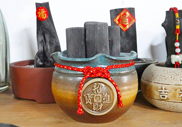 除了燒烤使用,埔光炭業將木炭重新包裝,取「炭」與「賺」的諧音,推出一直「炭」擺件,賦予良好的寓意,成為獨一無二的禮品,也正好可以在溼氣重的冬季,變成除濕、除臭的居家好物。