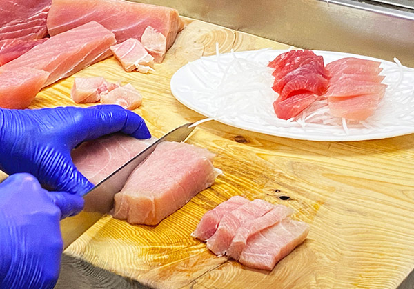 魚鰓是否鮮紅、魚的油脂分布是否均勻......這些小細節,都躲不過彭老師的利眼,讓她總是能買到頂級的鮮魚。再搭配她快、準、逆紋切的俐落刀法,每片生魚片都細緻甘甜又爽韌有嚼勁。