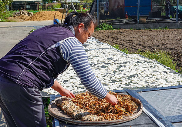 為了做出跟麥阿婆手藝一樣的美味,麥灶小廚第四代麥欣嵐大姐,在冬天種植芥菜,收成時會在田裡進行萎凋,再進行大約一個月的醃漬成為酸菜;醃漬的酸菜日曬三、四天,裝瓶發酵兩個月,就是常見的福菜;把福菜纏繞成捆,曝曬後放陶甕發酵,就是香氣十足的梅乾菜。