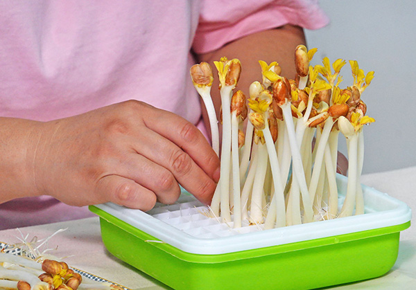 清脆爽口的花生芽菜,料理方式很多元,簡單的方法可以將芽菜川燙後,搭配生菜、胡蘿蔔、小番茄再淋上胡麻醬,就是一盤營養滿分的生菜沙拉,也能以潤餅的形式,將花生芽菜和雞蛋、肉鬆、花生粉用潤餅皮包在一起享用。花生芽菜不只是健康食材,還是餐桌上最具驚喜的創意料理主角。