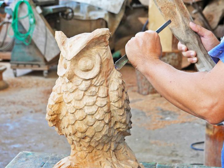 對賴瑞儒老闆來說,木頭每個部位都可以拿來創作,只是他會根據木料的大小和木頭的紋路,來判斷它適合製作成什麼成品,像紋路較直的木頭,就很適合用來製作大型家具或櫥櫃;崎嶇的木紋則是適合做成木雕品,而賴瑞儒老闆的人氣木雕品之一,就是貓頭鷹,他選好木材後,會先畫草圖用鏈鋸機做粗胚的裁切,接著用雕刻刀一鑿一鑿把貓頭鷹的外型、羽毛的紋理完成,再來就是戲修打磨、上漆保護,一個栩栩如生的貓頭鷹木雕,從無到有,至少要花一個月的時間才能完工,即使過程繁瑣、耗時、揮汗如雨,他也甘之如飴,並持續精進自己的雕刻技法,希望讓更多人看見手工木雕的魅力。