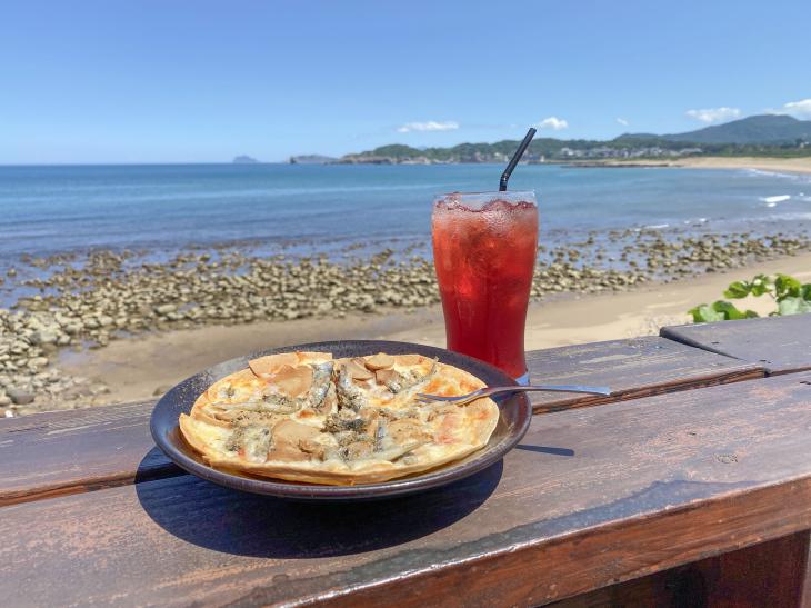 車來車往的道路上,一身亮眼橘色的烏咪小巴,就停駐在金山中角灣旁,它坐擁180度海景的絕美景觀,吸引許多旅客停下腳步,坐在陽傘下悠閒地享受咖啡和餐點。有著好手藝的趙士超老闆,並沒有因為行動餐車的侷限性,使飲品和餐點打折扣,從他手裡端上桌的每杯咖啡,都是他用精選的咖啡豆、研磨成粉、以精準的水溫與流速沖泡,最後再用咖啡拉花點綴,讓客人擁有嗅覺、視覺、味覺三大享受。咖啡餐車最特別的餐點之一,就是用金山在地新鮮捕撈的寮仔魚,搭配起司、特製醬料現烤而成的寮仔魚披薩,鹹香酥脆的口感,是許多懂吃的旅客必點的招牌美食。