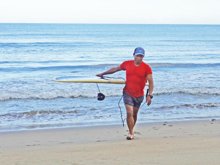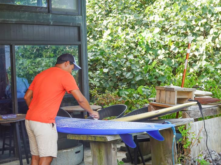 而烏咪小棧則是衝浪愛好者必訪的店,趙士超老闆提供陸上划水起乘動作講解,以及安全事項教學,還有下水的教學,會先從推板開始,讓學員熟悉起乘姿勢,以及追到浪的感覺,再慢慢引導學員看浪選浪,手把手的詳細教學,不只年輕人享受其中,許多國中小的學生,在家長的陪同下,也完成他們人生第一次的衝浪體驗。對趙士超老闆來說,他更希望能推廣金山的海洋文化,所以他和社區合作,推出撿笠螺體驗,帶大小朋友走入潮間帶撿拾笠螺外,也認識海女文化和自然生態,再透過笠螺相框的手作,為旅遊創造難忘的回憶。